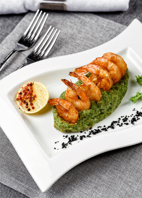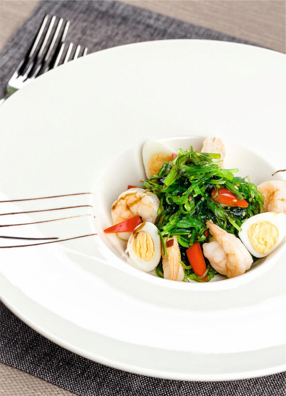 Водоросли чука выкладываем на дуршлаг, даем стечь лишней жидкости. Креветки тигровые размораживаем при комнатной температуре и готовим на пару 23 минуты.