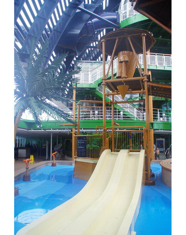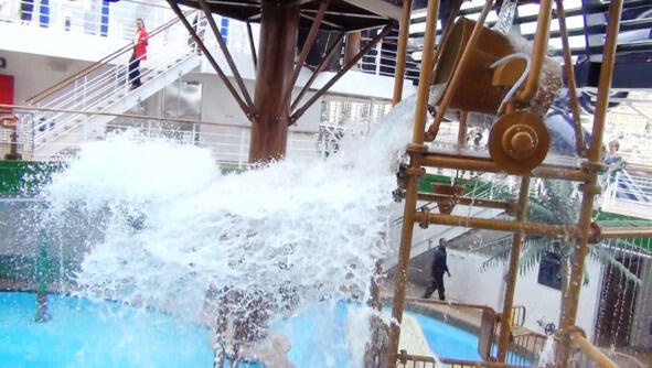Детская водная площадка с большим ведром воды. Звучит колокольчик и ведро опрокидывается. Нам очень здесь нравилось, часто заглядывали с женой, Особенно, когда было жарко. Вода из ведра, конечно, была не ледяная, но достаточно холодная, чтобы резко освежиться.