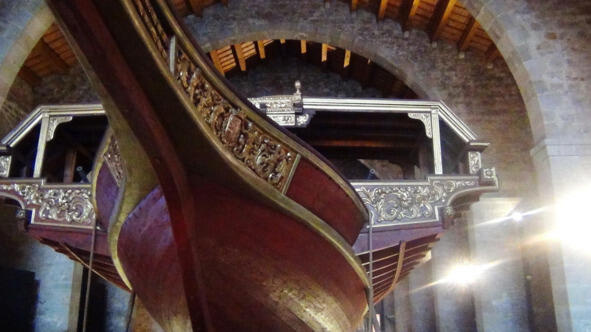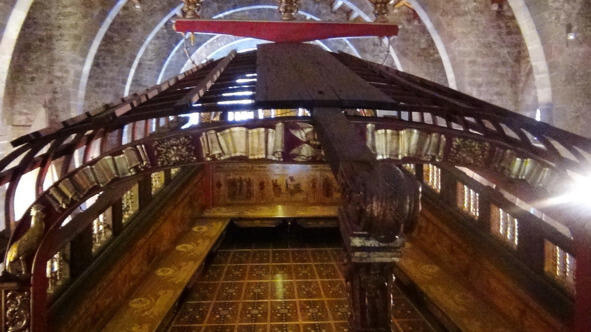 Конечно, гордостью музея является копия Королевской галеры Real, флагманского корабля флота Священной лиги в битве при Лепанто (1571 г.) Там испанцы накостыляли туркам (Османская империя) изрядно. Галера Real столкнулась в битве с главной галерой турок «Sultana». Там находился командующий войсками Османской империи Али Паша. В ходе огневого контакта Али Паша был убит, и его голова была поднята на высокой пике. Что вызвало великую панику в турецких рядах. В иоге турки потеряли 224 корабля, погибли 15 тысяч солдат, и около 5 тысяч попали в плен.