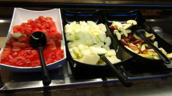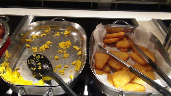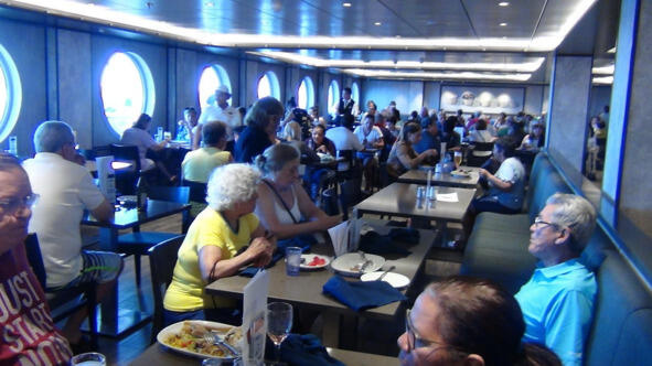 Пока наш Seaview рассекает волны Средиземного моря, поговорим немного об еде. Два основных ресторана «Золотой песок» на пятой палубе и «Серебряный дельфин» на шестой. Мы вначале ходили завтракать в «Золотой песок», но затем перестали. Тамошний кофе был хуже, чем в буфетах. Оно конешно, можно было заказать за евро настоящий капуччино или американо, но это не входило в наши финансовые планы. К тому же ресторан начинал работать в 730, а мы были ранними пташками, вставали в 6, а просыпались иногда и раньше. Поэтому большую часть круиза мы ходили завтракать в буфет на 8-й палубе. На 16-й буфет почему-то сразу не понравился ввиду больших очередей.