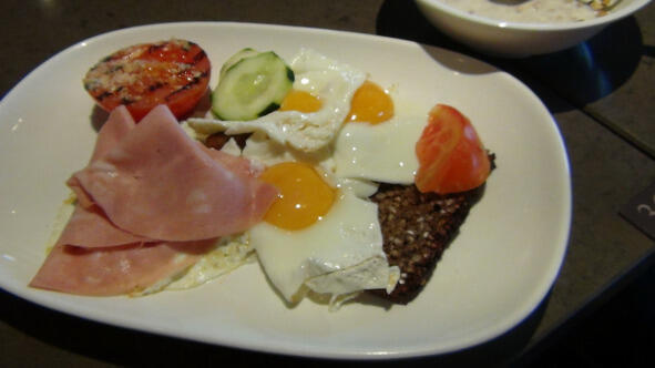 Итак, завтрак. Он был незатейлив и однообразен. Я брал почти всегда яичницу-глазунью, парочку маленьких сосисок, немного колбаски, огурчики, помидоры, фрукты и кофе. Соки были прилично разбавлены, поэтому их не брали.