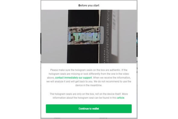 Перед тем как начать работу с кошельком, убедитесь в том, что голографическая наклейка хорошо наклеена, когда вы ее снимите, все равно останутся следы, и это нормально, это нужно для вашей безопасности. Нажмите зеленую кнопку «Продолжить».