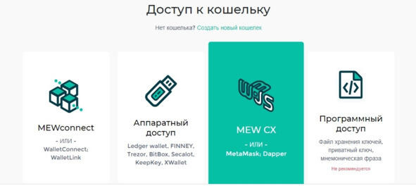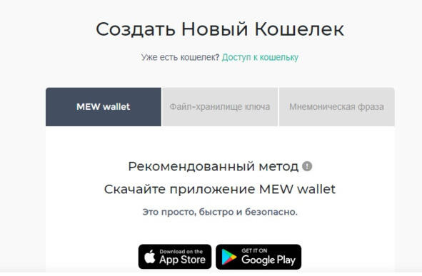 Для создания кошелька надо выбрать вариант: либо скачать приложение, либо воспользоваться установкой на устройстве через создание файл-хранилища ключа или мнемонической фразы.