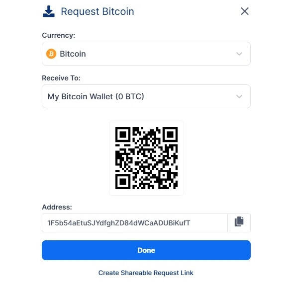 Чтобы получить свой биткоин, нажмите «Request» в верхней части экрана и скопируйте адрес своего кошелька.