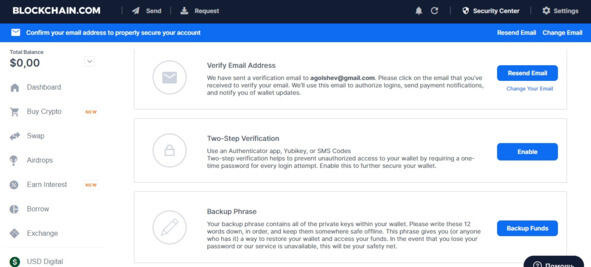 Первым делом зайдите в Security Center подтвердите свой email, установите двухфакторную верификацию и создайте backup-фразу.