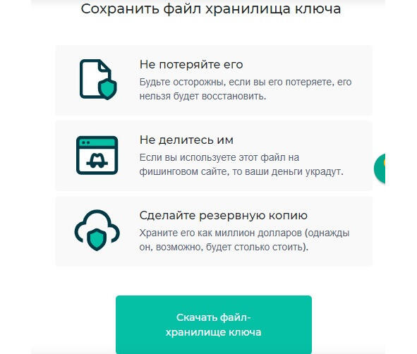 ВАЖНО! Файл-хранилище ключей лучше хранить отдельно на флешке без доступа к интернету. Сид-фразу также можно хранить на флешке или на бумаге в безопасном месте!