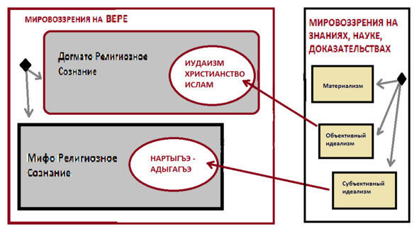 Из пяти вышеуказанных, для черкесов, родным является мифорелигиозное мировоззрение. Оно основано на вере в духовное завещание предков, в истинность знаний, полученных предками трансцендентными и иными путями, включая знания, полученные в ходе рассуждений, логических, философских построений (т.е. знания, полученные вполне научным путём). Нам следует знать, кто тысячи лет был поставщиком ценных знаний, для наших далёких предков.