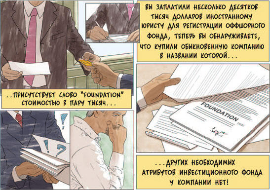 Либерализм законодателей многих оффшорных территорий в отношении тех слов, которые можно использовать в названиях компаний, может сыграть злую шутку с потребителем оффшорных услуг. Так, компания ABC Bancorp, зарегистрированная в штате Невада, так же как и компания ABC Banking House, вовсе не является ни Американской Банковской корпорацией, ни английским Банкирским домом в том смысле, который мы придаем слову БАНК. У них нет ни банковской лицензии, ни сколько-нибудь существенного оплаченного уставного капитала, ни резервного фонда. Единственным их активом, как правило, является пакет документов стоимостью в несколько сотен долларов.
