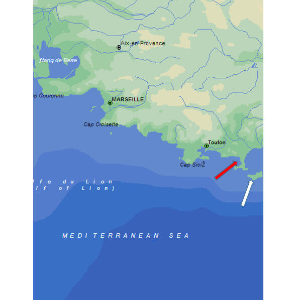 Бухта Йер (красная стрелка), остров Поркероль (белая стрелка)