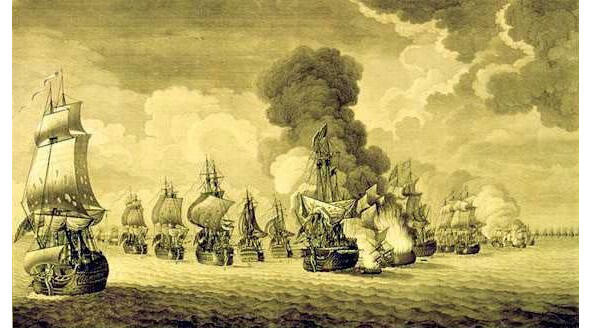 В адмирал Мэтьюз с тремя кораблями ведет ближний бой с испанской эскадрой