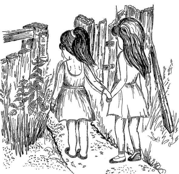 Мы же только на минутку, только посмотрим, а потом сразу на речку побежим сказала Лиза и стала пробираться сквозь густые заросли кустов. Аня последовала за ней. Кусты были очень густые и хватались за руки, ноги и платья девочек так, что у Ани оторвался маленький клочок от рукава платья Пробравшись через заросли, они оказались перед небольшим забором с калиткой. Калитка была не заперта, но на ней на одном погнутом гвозде висела деревянная дощечка. На ней красной краской от руки было написано «Если хочешь дожить до утра НЕ ВХОДИ!»