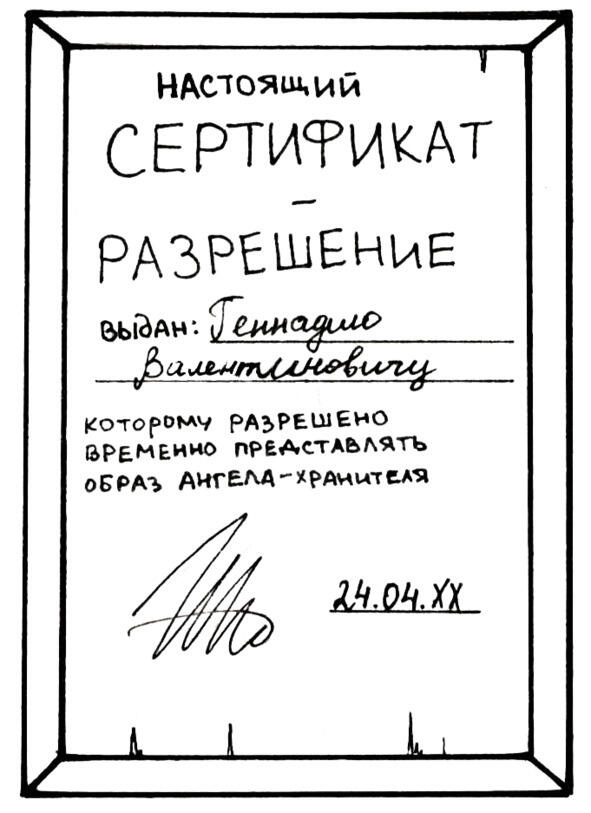 Настоящий сертификат-разрешение выдан Геннадию Валентиновичу, которому разрешено временно представлять образ ангела-хранителя. Подпись, дата, прочитала вслух девушка.