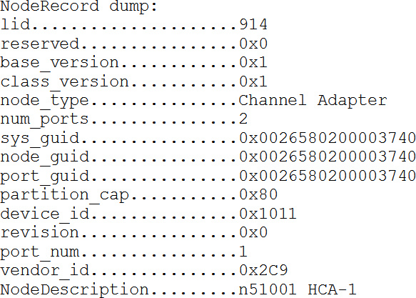 При помощи smpquery доступна информация о том узле, которому адресован запрос. В то же время менеджер подсети имеет информацию обо всех узлах подсети. Запросить информацию у менеджера подсети можно при помощи утилиты saquery. Информацию об узле подсети с LID 914 можно запросить командой saquery 914. Вот пример выдачи такой команды: