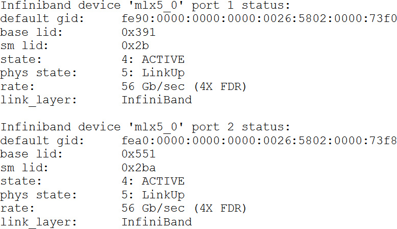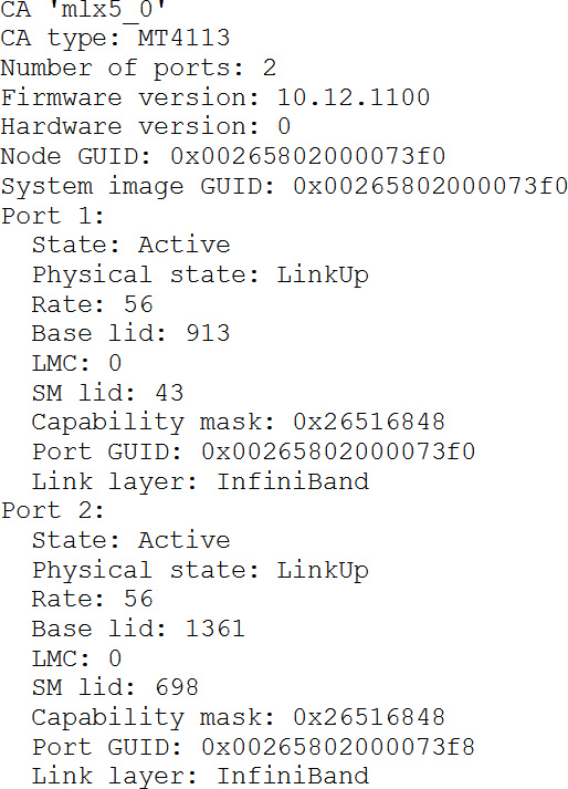 Для каждого порта в строке Link layer выводится тип подключения: InfiiniBand или Ethernet. Некоторые адаптеры InfiniBand позволяют подключаться как к сети InfiniBand, так и к Ethernet. Тип подключения определяется установленным трансивером. Строка Port GUID показывает GUID порта. Base lid первый LID, присвоенный данному порту. Всего порту присвоено, как говорилось выше, 2LMC подряд идущих LID. SM lid LID порта, на котором работает менеджер данной подсети. Rate скорость передачи данных, на которой работает порт (56 в данном случае это режим 4x FDR).