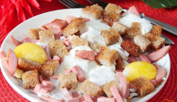 Issue: 10 eggs, 1/2 pound of cooked sausage, 1/8 pound of Chukhon butter. Heat a frying pan with oil and fry in it thinly sliced cooked sausage or ham; when it is slightly browned, release the eggs and do as in the previous recipe.