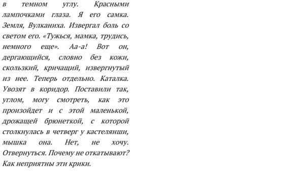 Пьян. Ерунда какая. Разве мы не самые сильные, самые мощные? Главное дело сделано. Бубубов позвонил ректору. По-о-озво-о-онил! А теперь надо попасть ключом в этот Сезам. Да нет, я вел себя прилично. Анекдот про корову. Много шутил, изобретал. Бубубов смеялся надо мной, как над ребенком, издевался, конечно, и при всех еще, при женщинах, ну и что, самое главное, что Бубубов позвонил, потому и издевался, что позвонил. Толкнуть плечом. Бубубов. Разве мы не самые сильные? Свет в туалете. Опять забыла. Свет в туалете не тот. Мамаша не померла ли? Открыть Так и есть. Так и знал. Значит, вот так это и происходит. Бубубов. Настигает вот так, рядом с унитазом. Желтые патлы матери, испачканные ее же говном. Мне надо будетмыть ей голову сегодня ночью. Этот оскал. Какой трезвый жестокий взгляд, она умерла не сумасшедшей. Что видела? Даже для стариков смерть отвратительна. Я профессор. Слава богу, что умерла, наконец, отмучилась, освободила. Когда-нибудь я заплачу за все