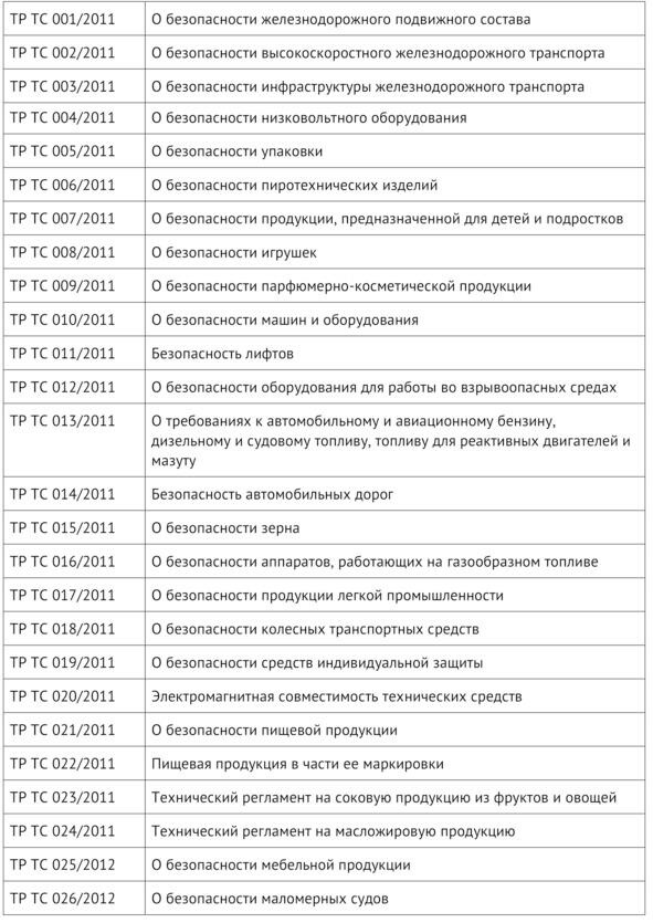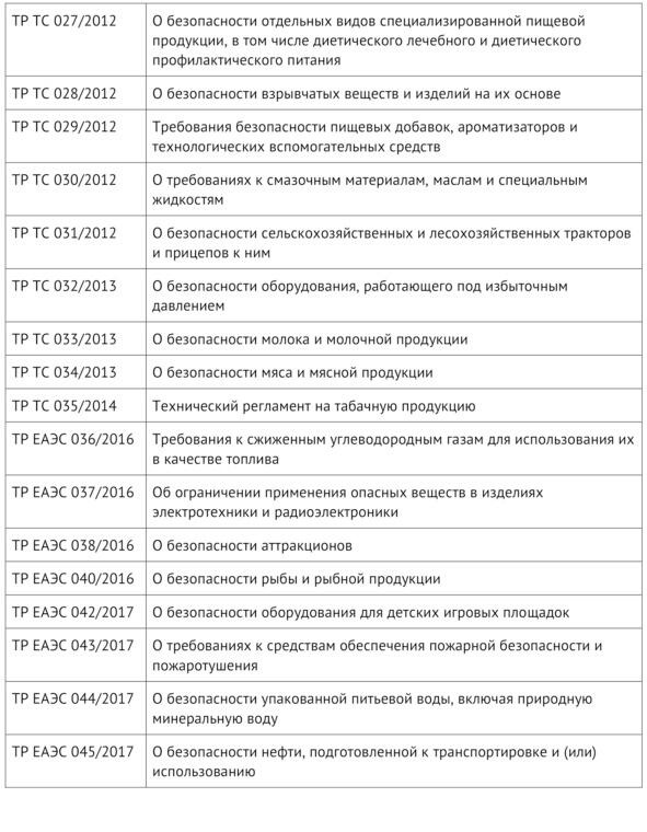 Таблица 2. Технические регламенты Евразийского экономического союза.