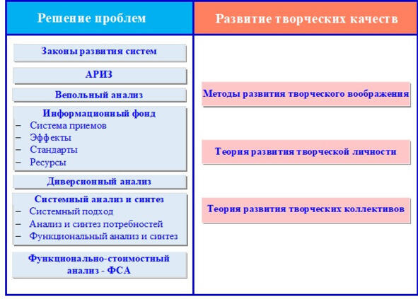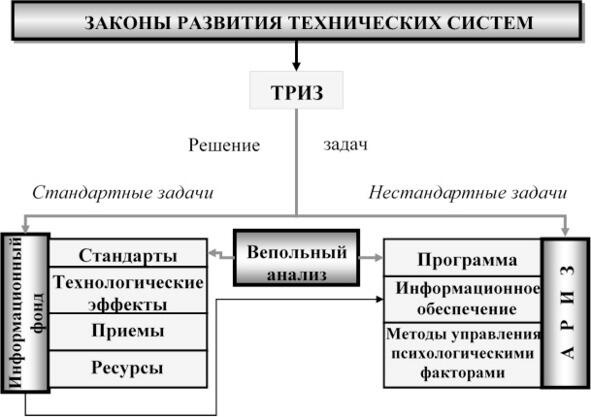 Все разделы ТРИЗ можно разделить на две части: методы решения задач и методы развития творческих качеств. К методам решения задач относятся пп. 17 (приведенного выше списка), к методам развития творческих качеств пп. 810. Структурная схема ТРИЗ согласно этой классификации представлена на рис. 2.2.