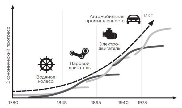 Это определение вписывается в широко принятую концепцию смены технологических укладов, где трансформация на базе ИКТ является одним из этапов (рис. 1.2). Кривая изменения экономического прогресса (роста производительности труда) отображается в виде S-образной кривой с периодами зарождения (медленного роста), активного роста и зрелости (замедления роста).