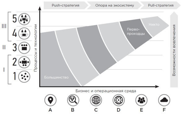 Наличие указанных стадий развития технологий автоматизации определяет последовательность периодов, которые проходит бизнес: A (локальный охват), B (региональный охват), C (глобальный охват), D (суперглобальный охват), E (цифровой охват без посредников) и F (текучий охват).