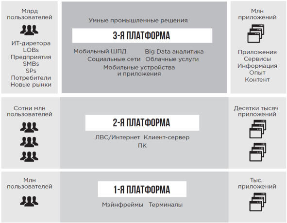 В то время как одни исследователи говорят о том, что цифровая трансформация происходит с момента возникновения цифровых технологий и, следовательно, внедрение любой цифровой технологии будь то новый веб-сайт или ERP-система это очередной шаг на пути цифровой трансформации, другие утверждают, что цифровая трансформация это новый тренд, и связывают его с определенным набором новых технологий. Существует мнение, что появление третьей платформы (облака, мобильность, соцсети, «большие данные») это именно тот рубеж, который и обозначает цифровую трансформацию. По мнению приверженцев данной точки зрения, например, [5], все предыдущие технологии лишь готовили цифровую трансформацию. Оцифровка была «прокладыванием пути» для будущей трансформации. До появления третьей платформы цифровые инструменты использовались лишь для автоматизации существующего способа организации бизнеса. Системы типа MRP, ERP, CRM, в первую очередь, были направлены на поддержание существующей бизнес-модели, в частности, обеспечивая сохранность электронных документов в неизменном виде, не меняли бизнес принципиально и не задавали новых правил игры. По мнению упомянутых исследователей, именно внедрение технологий третьей платформы позволило трансформировать бизнес-модели создать систему клиентов и поставщиков, которая размывает границы между цепочкой поставок, исполнителями, партнерами, клиентами, и эта модель в существенной мере определила работу всей вышеобозначенной системы.