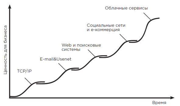 Совокупность технологических инноваций приводит к смене одного уклада на другой. Каждый из этапов экономического прогресса на рисунке 1.2 (включая стадию ИКТ) можно разделить на более мелкие части, и в каждой выделить свои трансформирующие технологии. Разные специалисты предлагают свою периодизацию. В частности, Сеиф Хардиди [2] (рис. 1.3) предлагает пять этапов, включая TCP/IP и заканчивая облачными технологиями, которые авторы рисунка обозначили как приложения «эластичного потребления».
