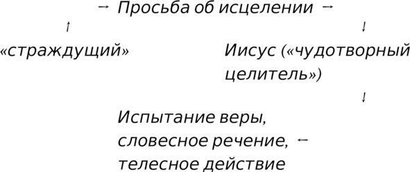 «Чудо» происходит в точке встречи Иисуса и «объекта» в ситуации «кризиса» или «страдания». Болезнь или недостаток «объекта» предполагает его готовность к изменению, необыкновенному контакту («молитва» или «просьба»), но также и «инициативу чудотворца», проявляющего благую волю. Как кульминация действия, происходит «чудесное воздействие» и «преображение», нередко мгновенное, в котором и заключается сверхъестественный эффект. Как следствие этого преображения выступает реакция «прославления» (обратный импульс от человека к Иисусу и самому Богу; «возвращение» той самой «ценности», обмен которой предполагается в общении сторон) и «торжество веры» («спасение»).