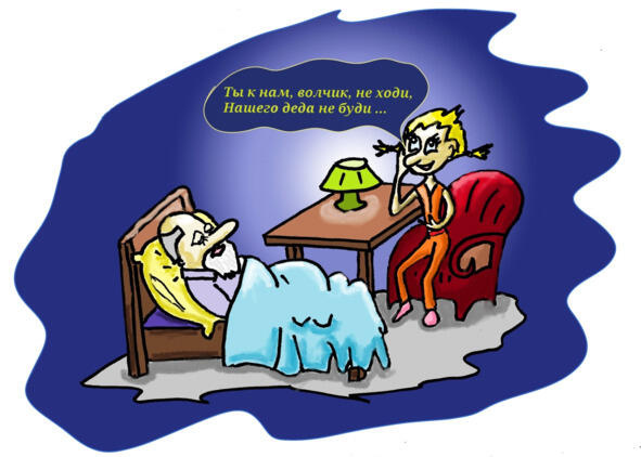 Дедушка, не спи. Тебе ещё нужно слушать колыбельную песню: «Баю-баюшки-баю, не ложися на краю. Придет серенький волчок и ухватит за бочок. Он ухватит за бочок и потащит во лесок, под ракитовый кусток. К нам, волчок, не ходи, нашего деда не буди».