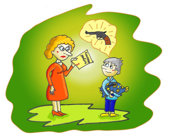 Вовка, ученик второго класса, принес из школы двойку. На первом листе новой тетради в линейку корявым почерком ученик написал: «Классная работа». На этом его участие в школьной работе закончилось. Наверное, поэтому внизу листа красными чернилами красовалась двойка, каллиграфическим почерком выписанная учителем. Все потому, что вместо урока Вовка мечтал о новом пистолете, который видел в соседнем магазине игрушек.