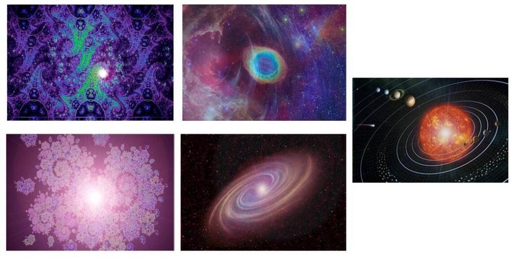 В макронаправлении на пределе наших познавательных возможностей он состоит из множества Вселенных. Каждая Вселенная состоит из скопления Галактик. Галактики из звездных систем. Звёздная система это звезды и планеты вокруг них, связанные гравитационным полем. Одной из таких систем является Солнечная система, в которой находится наша планета Земля.