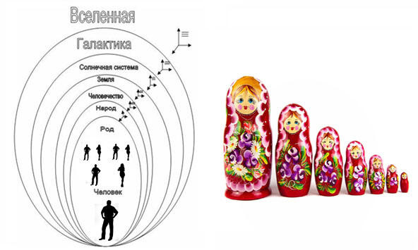 Самая простая аналогия русские матрёшки. Меньшая вкладывается в большую, а большая является «домиком», «средой» для меньшей. Настоящие матрёшки не являются точной копией они подобны друг другу. Это свойство гармонии, принцип фрактальности (рисунок 4).