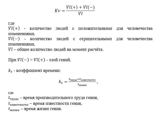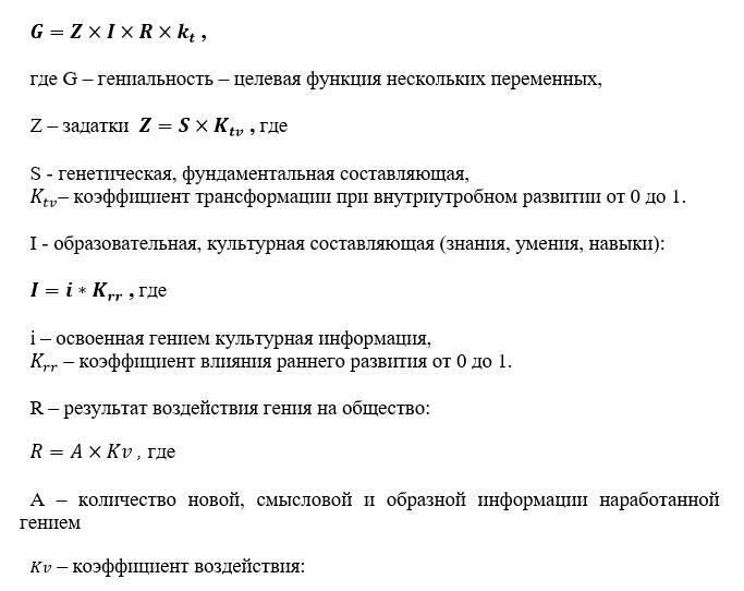 Общий смысл формулы в отражении закономерности все составляющие должны иметь такие значения, чтобыG(гениальность) стремилась к максимуму. Поэтому применена операция умножения. Важны все компоненты если хотя бы один равен нулю, то и в результате будет ноль.