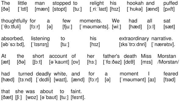 The little man stopped to relight his hookah and puffed thoughtfully for a few moments. We had all sat absorbed, listening to his extraordinary narrative. At the short account of her fathers death Miss Morstan had turned deadly white, and for a moment I feared that she was about to faint.