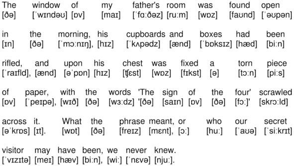 The window of my fathers room was found open in the morning, his cupboards and boxes had been rifled, and upon his chest was fixed a torn piece of paper, with the words «The sign of the four scrawled across it. What the phrase meant, or who our secret visitor may have been, we never knew.