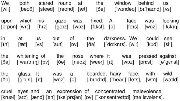 We both stared round at the window behind us upon which his gaze was fixed. A face was looking in at us out of the darkness. We could see the whitening of the nose where it was pressed against the glass. It was a bearded, hairy face, with wild cruel eyes and an expression of concentrated malevolence.