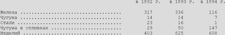 Трудно сосчитать общее количество экспонентов в отделе, но, и не считая, видно, что дело машиностроения в России не наше дело. Скажут, что это не важно, важно, чтоб капиталы прилагались внутри страны, а чьи они всё равно. Это правильно по существу дела, но едва ли этим можно утешаться и не видеть того, что намного уменьшает солидность возражения. Дело в том, что иностранец-предприниматель выписывает к себе на завод иностранцев-техников, а это не может не влиять на рост технического образования в стране. Затем следует помнить всегда, что «свой своему поневоле брат» и что всё, что можно сделать за границей, иностранец-заводчик сделает там. Так, например, многие заводчики даже рекламы свои заказывают в Лейпциге и Мюнхене, а это должно же о чём-нибудь свидетельствовать: или о несовершенстве типо-литографского дела у нас, или о любви заводчика к своей родине; но о чём бы, в конце концов, этот факт не свидетельствовал, он указывает, что капиталы иностранцев-предпринимателей далеко не целиком обращаются в России. Избави мя, боже, от человеконенавистничества, но дело в том, что, в конце концов, крайне обидно видеть Запад постоянно и всюду в роли нашего учителя, а нас в роли его учеников во всех областях приложения труда. В машиностроении и горнозаводском деле видеть это тем более обидно, что у нас в стране масса сил; неисчерпаемые сокровища сырья в виде железных руд не разрабатываются, и в то же время к нам ввозят до сего времени и чугун, и железо, и сталь, как об этом оповещает министерство финансов в своём издании «Производительные силы России» (издание «Производительные силы России. Краткая характеристика различных отраслей труда соответственно классификации выставки. Составлено под общею редакциею директора департамента торговли и мануфактур В. И. Ковалевского», СПб. 1896 Ред.). Насколько именно внутреннее металлургическое производство не удовлетворяет спроса страны, показывают следующие цифры ввоза, данные в министерском издании за три года: