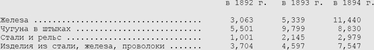 Это заключение, вместе с аналогичным ему по смыслу очерком русского машиностроения, помещённым профессором И. В. Худяковым в цитированном издании министерства финансов, стоят в непримиримом противоречии с приведёнными цифрами ввоза и вывоза металлов, цифрами, взятыми из того же издания. Можно, конечно, говорить, что на сокращение вывоза и увеличение ввоза влияет тот факт, что в годы, взятые министерством, заметно сильное стремление к увеличению железнодорожной сети и что в этом же направлении влияет постройка Великой Сибирской дороги. Но ведь в эпоху «пышного развития» нашего машиностроения строительная железнодорожная горячка свирепствовала гораздо сильнее, чем в данное время, это раз, а во-вторых, в то время наше машиностроение являлось «вполне окрепшим», и была высказана уверенность, что «в недалёком будущем» мы будем строить для себя всевозможные машины. Прошло четырнадцать лет, недалёкое будущее стало настоящим, и промышленность, пышно развившаяся в течение десяти лет, должно быть, не сделала ни шага вперёд на протяжении четырнадцати лет. Чем иным объяснить приведённые цифры, указывающие на то, что ввоз в Россию продуктов из сырья, которого у неё неисчерпаемые залежи, в три года возрос по всем статьям наполовину, а вывоз тоже упал наполовину?