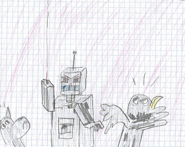 Все вокруг утихло. С потолка перестало литься. Макс прекратил жать на кнопки. Раздался противный металлический писк. Часть пола рядом с Максом разъехалась в стороны и наружу поднялся поблескивающий металлический куб. Куб повернулся вокруг своей оси, и начал быстро подниматься на двух гибких трубках. Затем из него выдвинулись два телескопических отростка. Из верхней части куба выехал куб поменьше. Потом на нем зажглись два глаза. Появился рот, растянутый в усмешке. И вот перед Максом уже стоял здоровенный робот.