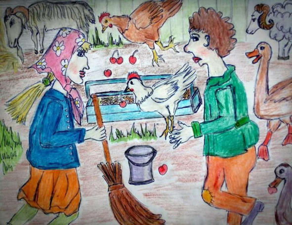 Ковыляя и пошатываясь, гуси и утки бежали за бабкой, громко посмеиваясь, а развеселившиеся представлением свиньи просто катались по полу.