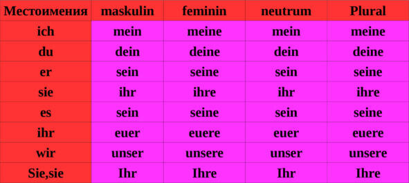 Помимо склонений есть еще и притяжательные местоимения. Притяжательные местоимения склоняются по родам. В немецком языке, как и в русском, есть женский, мужской и средний род.