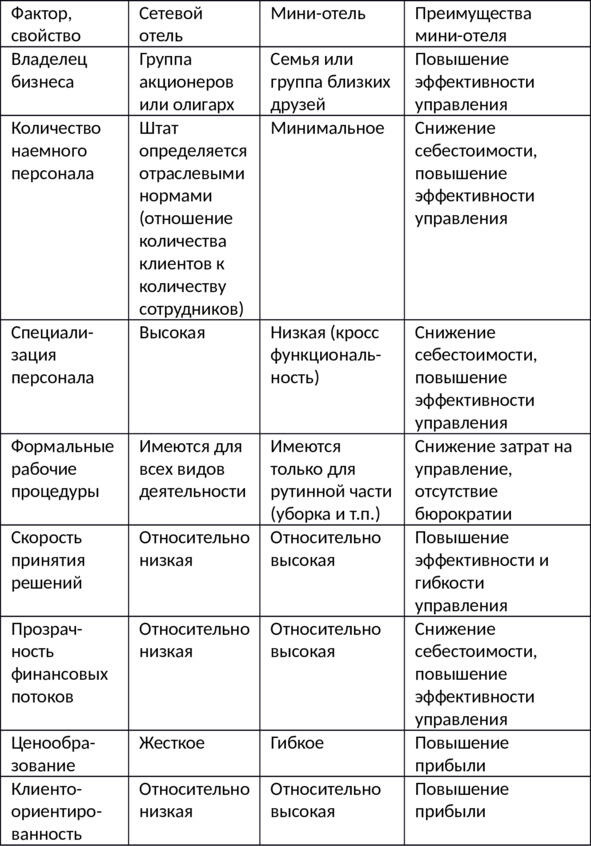 Следует отметить, что бизнес в малых отелях принципиально отличается от больших отелей корпоративного типа за счет таких факторов, как (см. также Таблицу 0.1):