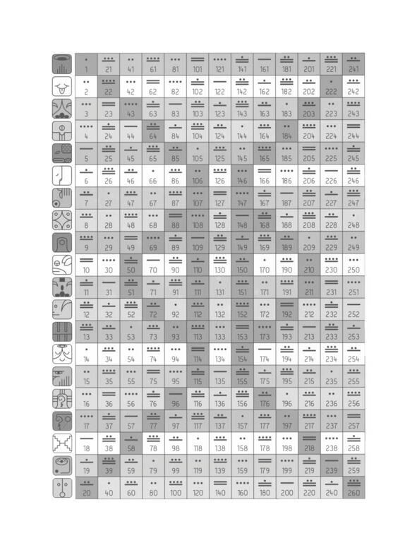 Календарь Цолькин состоит из 13 вертикальных столбцов, которые имеют точечно-черточное обозначение. Одна точка 1, две точки 2, три точки 3, четыре точки 4. Одна полоска 5, две полоски 10.