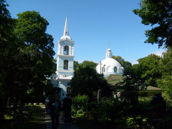 Видят они великолепный вид на Собор, который находится на реставрации. Почти весь обставлен лесами. Заходят на территорию кладбища. Стоит небольшая церковь. Налево асфальтированная дорожка, которая привела паломников к часовне Святой Блаженной Ксении Петербуржской. Часовня средних размеров, не маленькая
