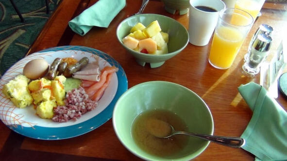 Так-с. А вот это наш плотный завтрак. Состоит из омлета, куриного яйца, мясного фарша, огурчика, ветчины, очень вкусного слабосоленого лосося, трех маленьких сосисок, стакана джуса (очень вкусный!), кофе, десерта из кусочков дыни. Марина брала еще йогурты, дабы сжигать лишние калории.