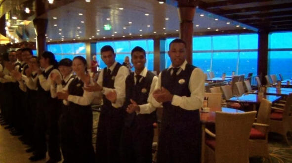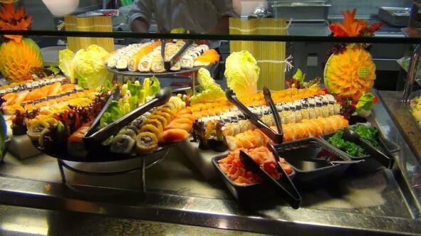 Отличное место, на 11-й палубе, где проходили завтраки и обеды для многих пассажиров, и ужины для желающих. Начну с ужина. Если вы обожаете суши, королевские креветки то вам сюда! Наверное, та молодая пара, что не приходила больше вечерами в «Рембрандт», очень любит эти вещи. Каждый раз, в 1830, гостей встречали улыбки официантов, которые, выстроившись в ряд, пели «Макарену».
