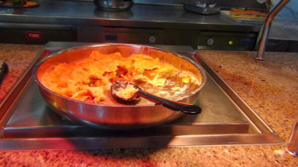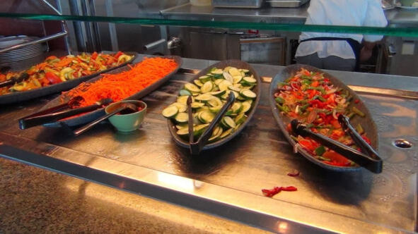 Для полноты отчета заглянул я в последние дни на обед, немного пофотографировал. Как-то стесняюсь делать это со вспышкой, люди кругом, а я типа инспектор проверяю и фиксирую качество пищи. Ну, что вышло, то вышло. Вот прошелся по ряду, где выставлена еда на обед.