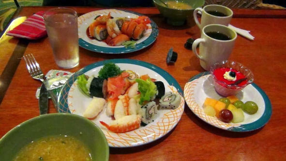 Вот наш скромный ужин. Не судите строго, мы проголодались за день, а на обед не ходили. Суши, огромные креветки (жена их очень любит), зелень, имбирь, васаби, соевый соус. А так же грибной супчик, десерт, фрукты (в основном, кусочки дыни), чай.