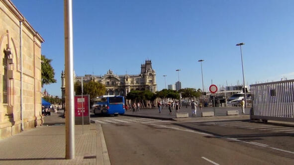 В Барселоне в круизы отправляются обычно на автобусах синего цвета, курсирующих между площадью Колумба и терминалами порта. Для тех, кто еще не знает, куда идти с чемоданами, ставлю пару фото. Вот там, где автобус высадка пассажиров с кораблей. Слева от здания памятник Колумбу.