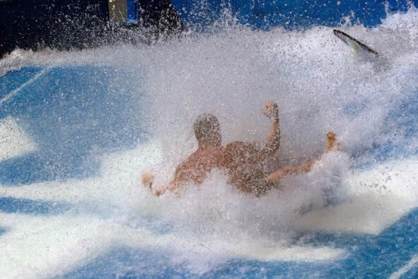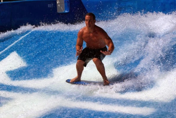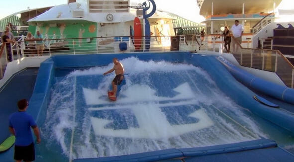 Так, постепенно, мы дошли до кормы судна. А там настоящее веселье! Сооружение под названием flowrider, флоурайдер по-нашему, искусственная волна для серфингистов.