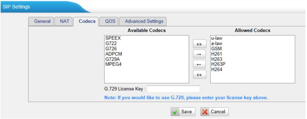Можно выбрать допустимые кодеки для связи шлюза с Elastix: